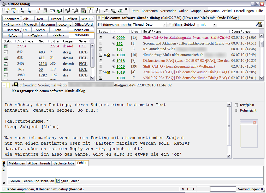 Für 40tude Dialog gibt es sogar eine extra Newsgruppe, nämlich de.comm.software.40tude-dialog, diese ist deutschsprachig.