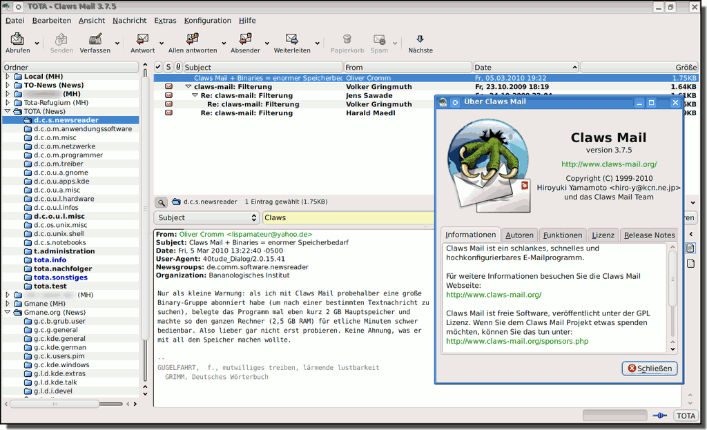 » Zu Claws Mail gibt es auch passende deutsch-sprachige Newsgroups: