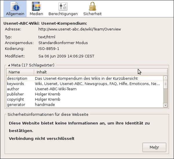 Ein interessantes Feature ist im Menü "Extras" enthalten, nämlich "Seiteninformationen". Hiermit können in einem neuen Fenster viele verschiedene Informationen über eine angezeigte Webseite entnommen werden: