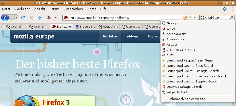 In Firefox ist bereits in der Werksauslieferung ein Extra-Feld für Websuchen über verschiedene Suchmaschinen integriert. Über das dort integrierte Drop-Down-Menü lassen sich weitere Suchmaschinen integrieren. Für die Suche gibt man dann in das Suchfeld ein individuelles Suchwort ein und klappt dieses Drop-Down-Menü herunter, um sich eine Suchmaschine für die Suche auszusuchen.
