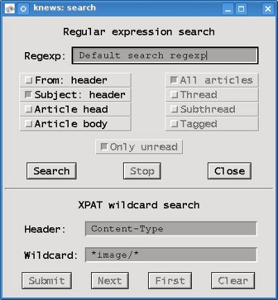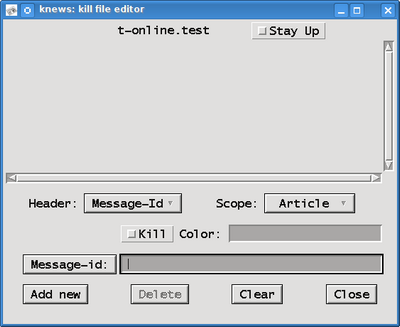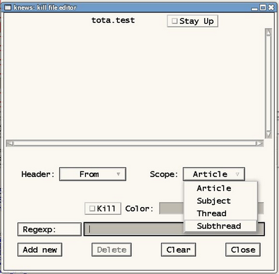 knews beherrscht Killfiling für die aktuelle Newsgruppe. Hierzu gibt es den Button "Kill..". Vorher solltest du auf einen betreffenden Artikel klicken und diesen öffnen. Dann auf den oben genannten Button klicken, der ein folgendes Popup öffnet: