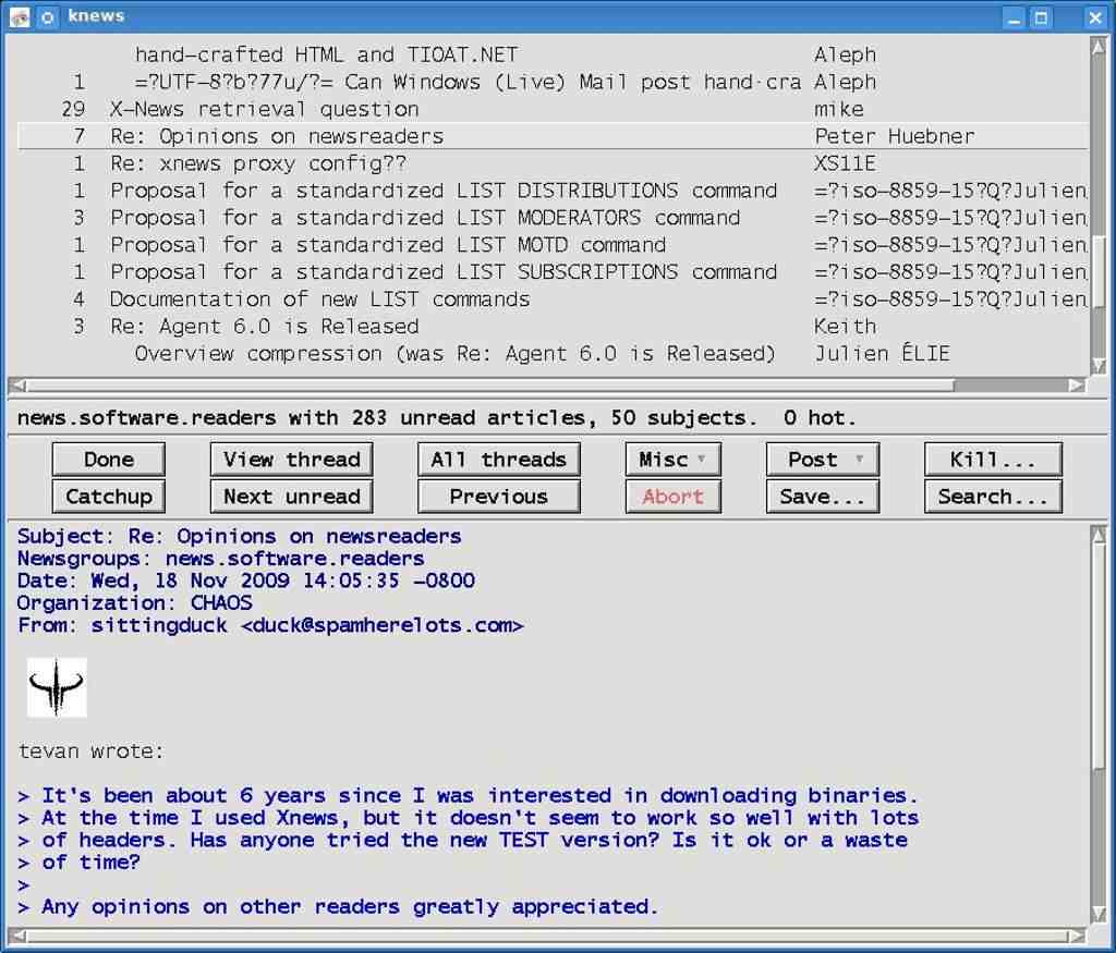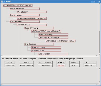 knews kann Threads dementsprechend anzeigen, wenn in der Nachrichtenliste das OP angeklickt wurde und dann der Button "View Thread" gedrückt wird. Das sieht dann so aus: