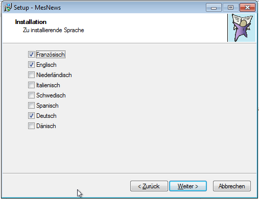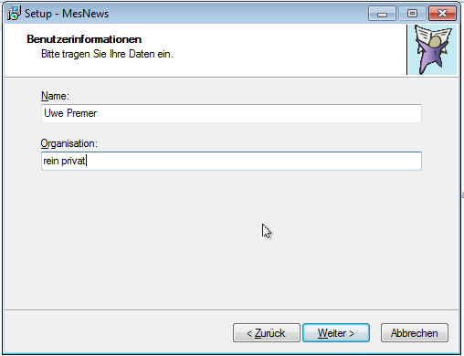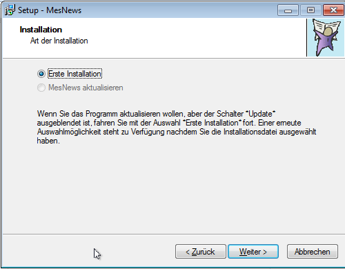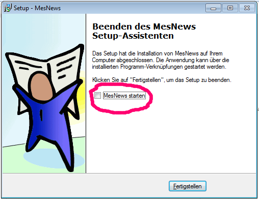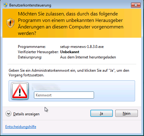 Zuerst muss das Binary "setup-mesnews-X.x.x.x.exe" von der Homepage heruntergeladen werden. ("X.x.x.x" steht für die jeweils aktuelle Versionsnummer).