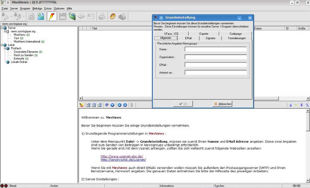 Nach dieser Grundkonfiguration steht MesNews für weitere Eingaben (Newsserver etc.) bereit.