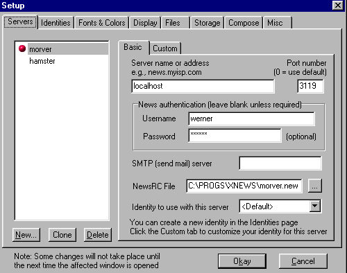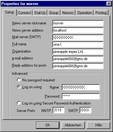 Gravity ![]() Wesentlich sind die Einträge in den Feldern "News server address" und "Server ports: NNTP". |