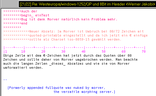 Als wichtigste Anwendung kann der Morver den fehlerhaften In- und Output der gängigsten Windows-Newsreader korrigieren. Seit neuestem ist auch PGP-Support integriert.