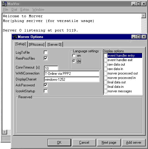 Nachdem die erforderlichen Dateien installiert sind muss zuerst der Morver konfiguriert werden. Rufe also das Programm (Doppelklick auf das Morver-Icon) auf, wähle das Menu Extras->Options und stelle die Sprache im Kasten "Language options" auf "de" um. Beende den Morver und starte ihn erneut. Bild 2: Morver, der erste Aufruf ![]() Wichtig! |