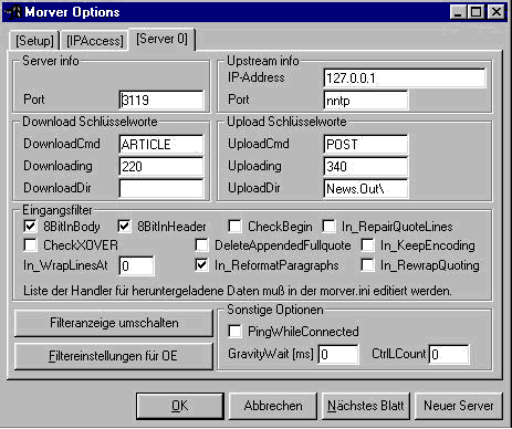 Wiederum im Menue Extras->Optionen in der Karteikarte [Server 0] muss im Eingabefeld IP-Address (rechts oben) die Adresse des Newsservers eingetragen sein, auf den du über den Morver zugreifen willst. Der vorgegebene Eintrag 127.0.0.1 gilt für lokale Server (z.B. Hamster); wenn du keinen solchen laufen hast, musst du hier den Namen deines Servers eintragen, z.B. news.t-online.de oder news.cis.dfn.de. Bild 3: Morver, das Optionsmenue ![]() Ansonsten sind die oberen 4 Kästen bereits für News vorkonfiguriert. Die Optionen im Kasten Eingangsfilter/Ausgangsfilter solltest du für den Anfang durch drücken des Buttons "Filtereinstellungen für OE" auf Standardwerte einstellen. Beende nun das Optionsmenue mit OK damit die Einstellungen gespeichert werden. Der Morver ist damit konfiguriert. Beende ihn und starte ihn erneut, damit die Einstellungen wirksam werden. PS: Selbstverändlich können auch die Benutzer anderer Newsreader die OE-Defaultoptionen verwenden. Angesichts der gegenwärtigen Probleme mit dem EURo sollte jeder außerdem noch die Option CheckXOVER aktivieren. |
