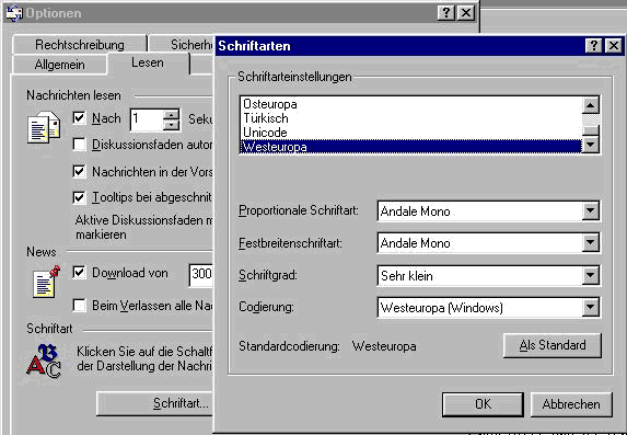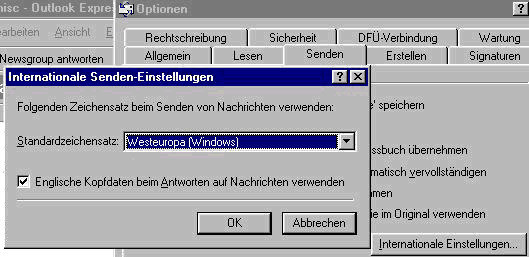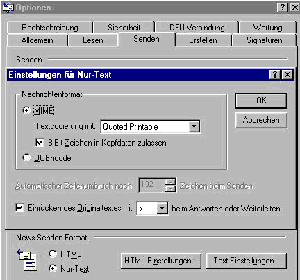 Nur für OE-User In Extras->Optionen ist Folgendes einzustellen: ![]() Bild 7: Option Senden->Internationale Einstellungen: Westeuropa(Windows) ![]() Bild 8: Option Senden->News-Senden-Format->Texteinstellungen: ![]() Beim Schreiben deiner Artikel darfst du nun nicht mehr die einzelnen Zeilen deiner Absätze durch Drücken der Eingabetaste umbrechen. Drücke einfach am Ende eines Absatzes 2 mal die Eingabetaste, damit du eine Leerzeile bekommst und schreibe dann den nächsten Absatz wie du es bei Verwendung eines Textverarbeitungsprogramms gewohnt bist. Bild 9: Ein Followup im Editor von OE ![]() Bild 10: Das gepostete Resultat im Artikelfenster von Xnews ![]() |