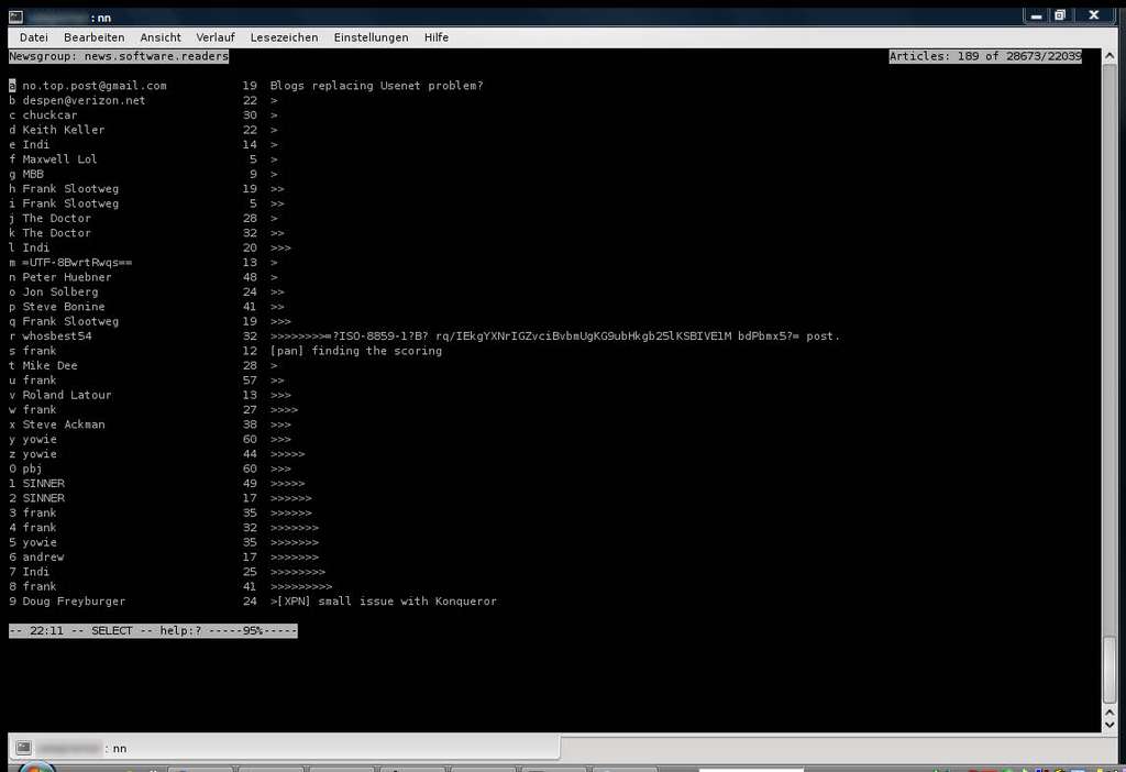 nn ist ein Newsreader und Mailer für die UNIX-Konsole und wurde von Kim F. Storm entwickelt.