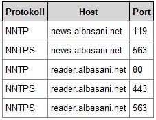 Bei news.albasani.net handelt es sich um einen kostenlosen Newsserver. Die Anmeldung erfolgt per E-Mail oder über das Kontaktformular. Informationen, wie Du Dich anmelden kannst, findest Du auch auf der Homepage von Albasani.
