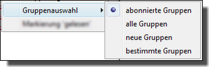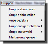 | Nach dem Download der Gruppenliste(n) geht es weiter mit dem Abonnieren von Newsgruppen. Dies erfolgt über das Menü "Gruppen". |