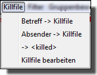 | Das Menü "Killfile" sagt ja schon alles. Hier können nicht genehme Postings in eine Blacklist (Killfile) aufgenommen werden. Der letzte Menüpunkt öffnet das Killfile zur weiteren Bearbeitung. |