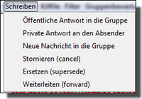 | Im Menü "Schreiben" öffnest du durch Klick auf "Neue Nachricht in die Gruppe" den Postingeditor, in dem du nur noch das Feld "Betreff" ausfüllen musst sowie deinen Text in das untere Textfeld eingeben musst. In der mittleren Buttonleiste brauchst du nur noch auf den Button "Nachricht senden" zu klicken; damit wird dein Posting zum Senden vorbereitet. Der eigentliche Sendevorgang muss wie folgt initiiert werden: Klick auf -> Menü "Datei" -> "Datenaustausch". Damit wird dann das Posting zum Newsserver abgesendet. Wenn du demgegenüber einen lokalen Newsserver verwendest, wird das Posting nicht direkt gesendet, sondern zunächst diesem lokalen Newsserver übergeben, der dann das Senden übernimmt. |