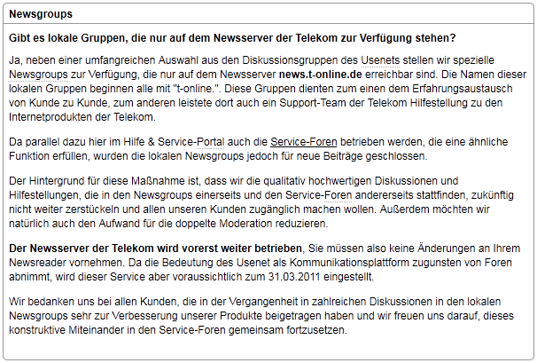 Weiterführende Links- Telekom-FAQ zum Usenet mit Statement zur Abschaltung von news.t-online.de zum 31.03.2011