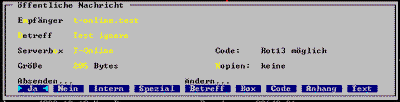 [b] (Kleinbuchstabe!)->Betreff (Subjekt) wie gewünscht ändern, da hier schon vorgegeben.-><Return>->die folgende Frage mit "Nein" (bzw. "N") beantworten.->Postingtext eingeben->wenn fertig-><ESC> drücken (Escape-Taste).->Folgende Frage mit "Sichern" bzw. S-Taste beantworten.