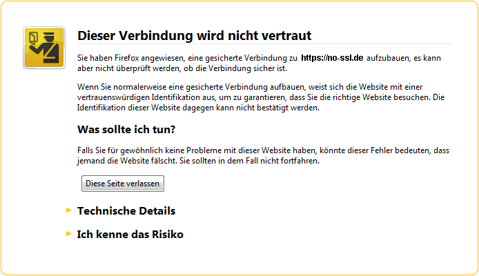 Das SSL-Protokoll wird dadurch initiiert, dass dem bekannten http ein s (s=secure) am URL angehängt wird. Sollte dieses Protokoll gewählt werden, prüft der Browser ob für diese Website ein gültiges SSL-Zertifikat vorliegt. Sollte sich das nicht bestätigen, warnt der Browser i.d.R. mit einem Hinweis auf die fehlende Verifizierung. Es wird die Frage gestellt, ob man den Vorgang wirklich fortsetzen möchte.