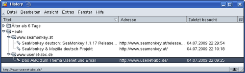 Wie zu sehen ist, werden die kompletten URLs der angesurften Seiten mit Uhrzeit beim Surfen dargestellt. Diese können später durch Anklicken wieder angesurft werden. Ebenso können diese URLs dort per Rechtsklick als Lesezeichen abgespeichert werden.