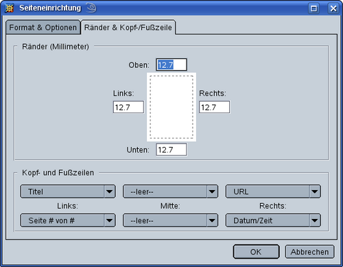 Über das Menü "Datei" können zunächst in einem Pop-Up-Dialog die erforderlichen Einstellungen seitens SeaMonkey zum Drucken gemacht werden wie z. B. "Ränder & Kopf-/Fußzeile". Die Werkseinstellungen sind auf diesem Bild zu sehen: