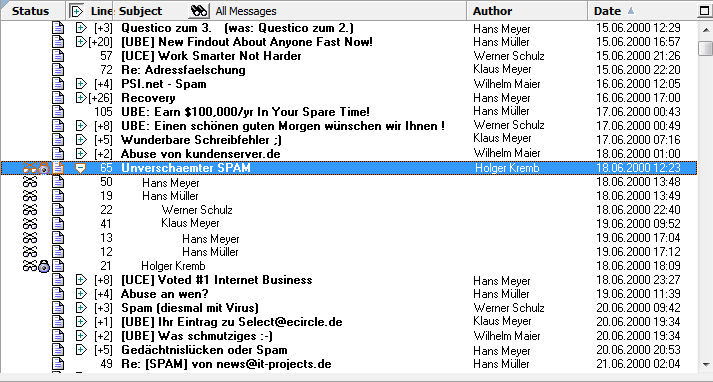 Im obigen Beispiel siehst Du einen Teil eines Screenshot meines Agents, der einige Threads mit Postings aufzeigt, die im Juni 2000 in die Gruppe de.admin.net-abuse.mail abgesetzt wurden.