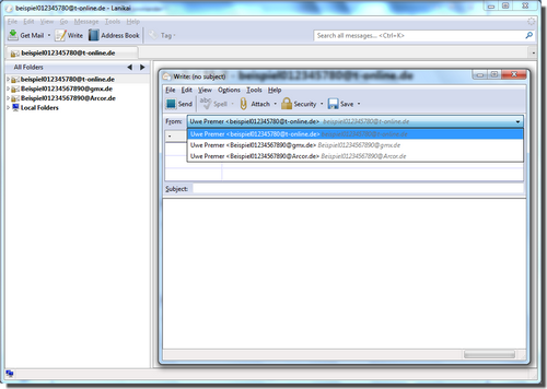 Der Vorteil bei Thunderbird liegt nun darin, dass beim Schreiben einer Mail im Thunderbird-Editor eine der vorhandenen E-Mail-Froms beliebig aus den Accounts ausgesucht und verwendet werden kann.