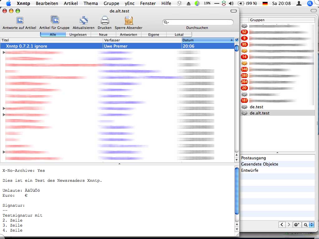 Xnntp ist ein deutschsprachiger Newsreader ausschließlich für Mac OS X, der von Florian Zschocke als Closed Source programmiert wurde und als freie Software konzipiert wurde. Der Autor des Programms freut sich auf Donations, die über seine Webseite (Link siehe unten) gemacht werden können. Bis zum Zeitpunkt der Erstellung dieses Beitrages liegt Xnntp als bereits recht stabile Betaversion vor. Das Programm ist bereits als Universal Binary erstellt und läuft daher nativ sowohl auf PPC-Macs als auch unter Intel-Macs.